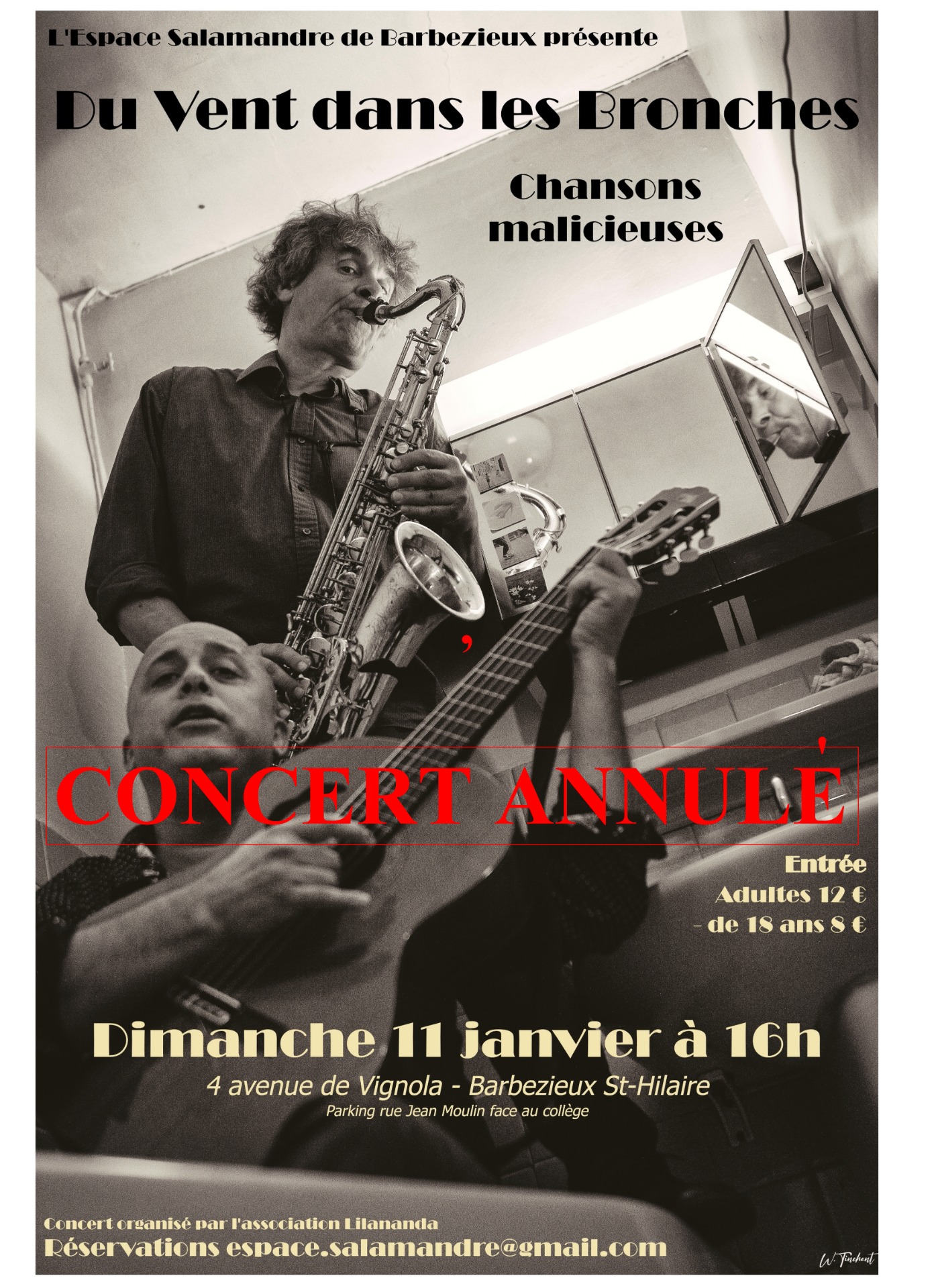 En raison du peu de réservations le groupe "Du vent dans les bronches", organisateur, à décidé d'annuler le concert prévu le 11 janvier 2026 (trop proche des fêtes de fin d'année)